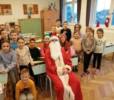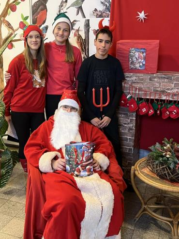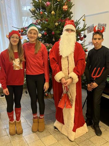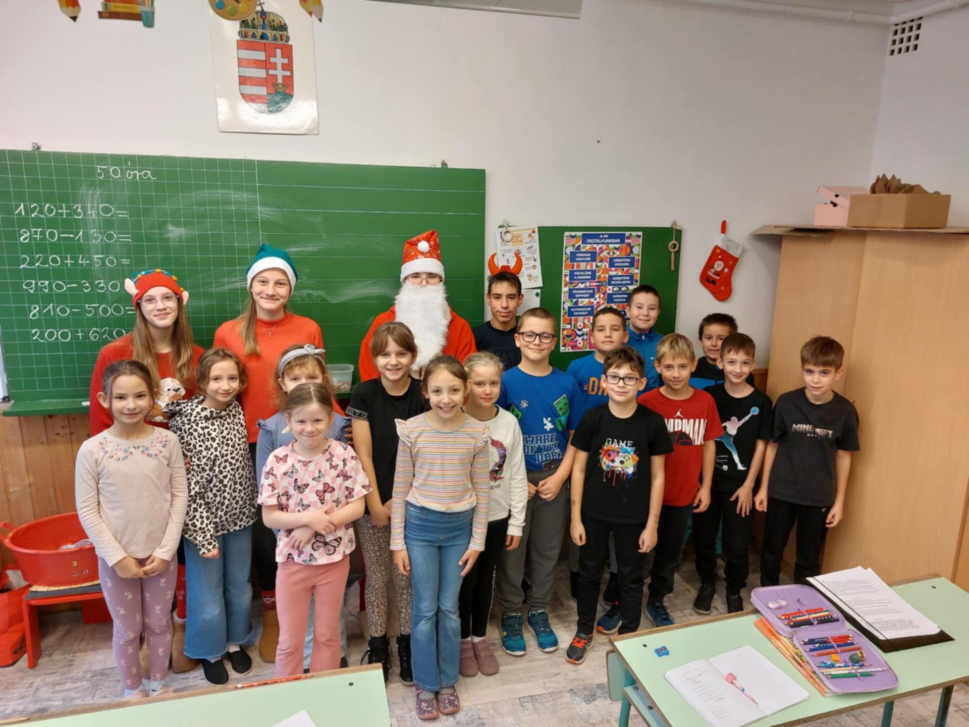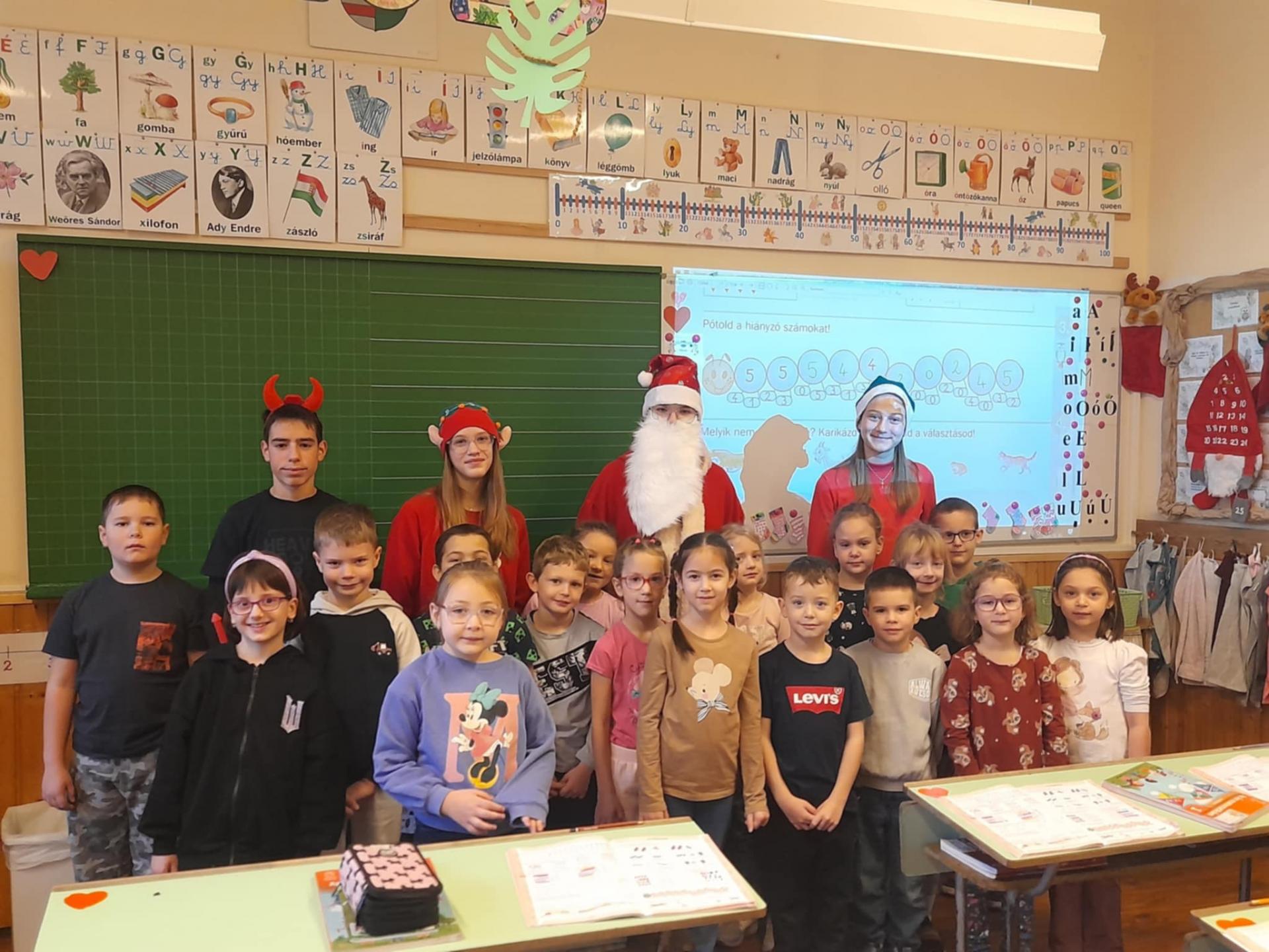 December 5-én, pénteken ismét ellátogatott a gyerekekhez a diákönkormányzat Mikulása. Nem láttuk hogyan érkezett, azt sem tudjuk hol rejtette el a szánját, de kicsik és nagyok egyaránt örömmel fogadták. Minden osztályba bekopogott, átadta a tanító nénik, bácsik kedves üzeneteit, és segítői vele, a manólányokkal és az ördög fiúval szaloncukrot osztogatott a sok jó gyereknek. Virgácsot senki nem kapott! A diákság fülig érő mosollyal várta a nagyszakállút, néhányan énekeltek, verset mondtak. Amilyen gyorsan jött, ugyanúgy távozott is, de a jókedvet itt hagyta nekünk!