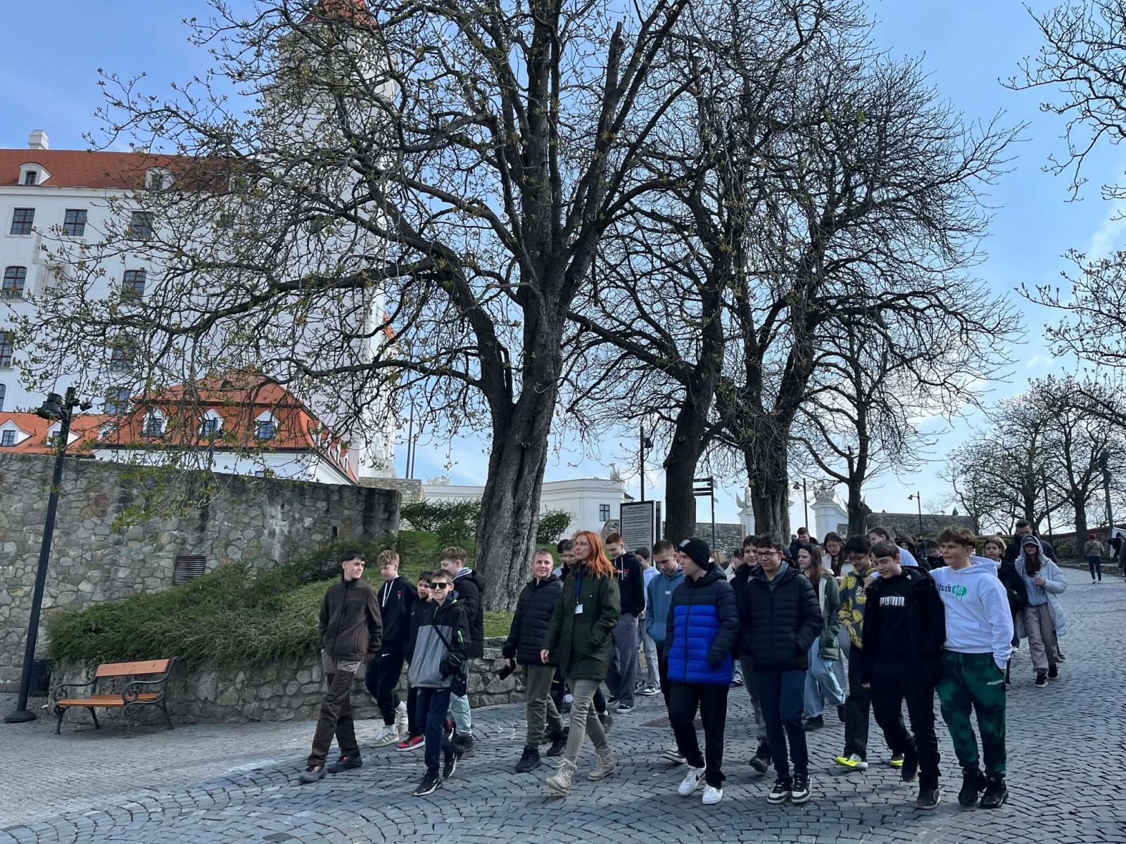 A negyedik nap reggelén elhagytuk a Jozefina Panziót, és hosszú utazásra indultunk a főváros, Pozsony felé. Sétáltunk egy keveset a várban – királyaink lakhelyén –, majd bejártuk a város történelmi központját, és felidéztük Pozsony magyar történelemben játszott szerepét. Láttuk az alsó és felső tábla egykori épületét, a Szent Márton-dómot – ahol az uralkodóinkat koronázták –, a Mihály-kaput, a régi városfal egyetlen megmaradt kapuját, a Grassalkovich-palotát, amely ma Szlovákia elnöki palotája, és közben hallhattunk számos izgalmas történetet és legendát a város múltjából. Például azt, hogyan támogatta Pozsony Liszt Ferencet, vagy hogyan került Bartók Béla Budapestre, és miért kísért egy női szellem a Mihály-kapu erkélyén. A programot némi szabadidő zárta, amikor a tanulók maguk barangolhattak egy keveset a főtér környékén.
