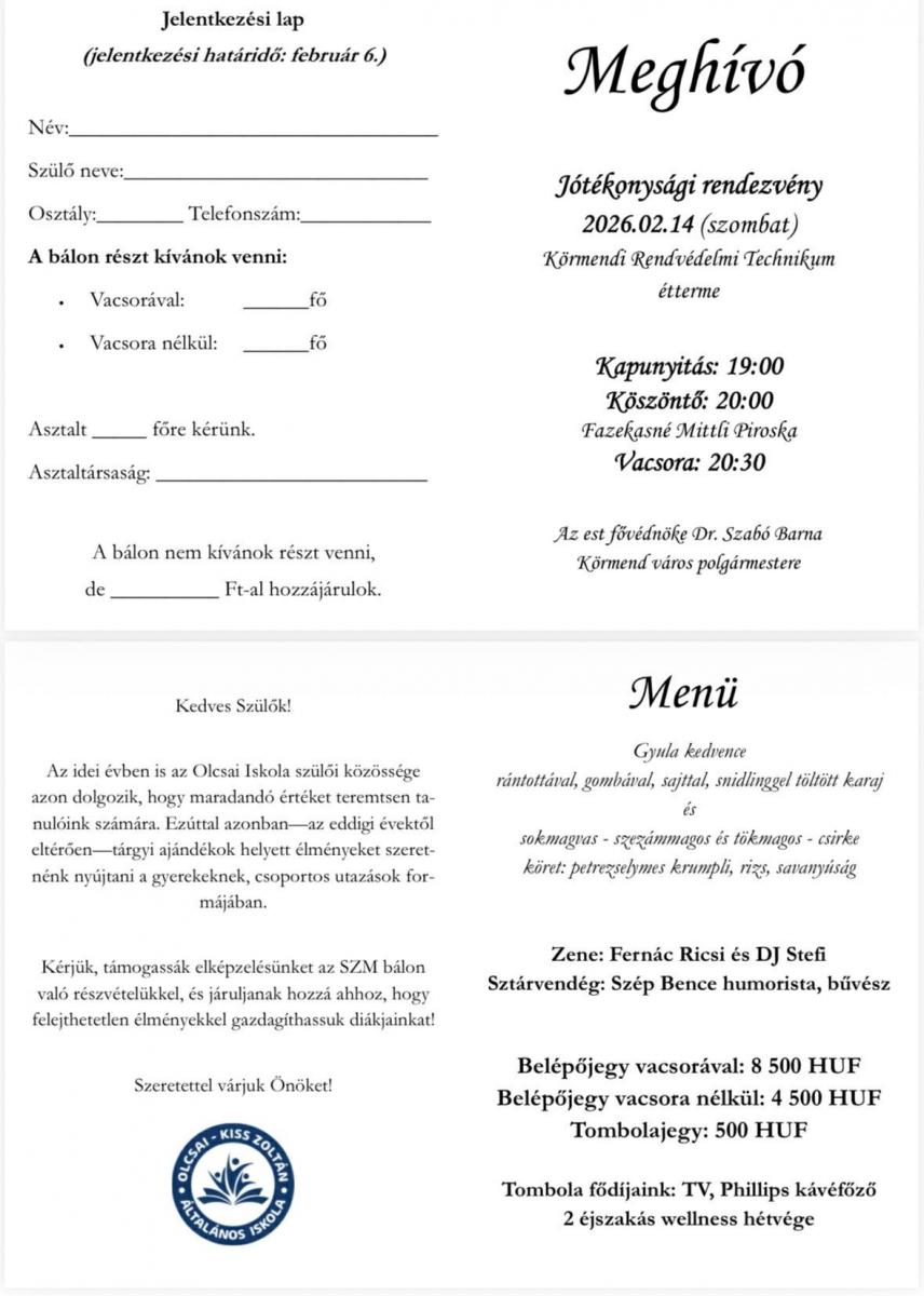 Híreink Jótékonysági rendezvény 2026.02.14-én 2026. január 16., péntek Hamarosan kiosztásra kerülnek a jelentkezési lapok. Keresse gyermeke táskájában! Vissza Megosztás