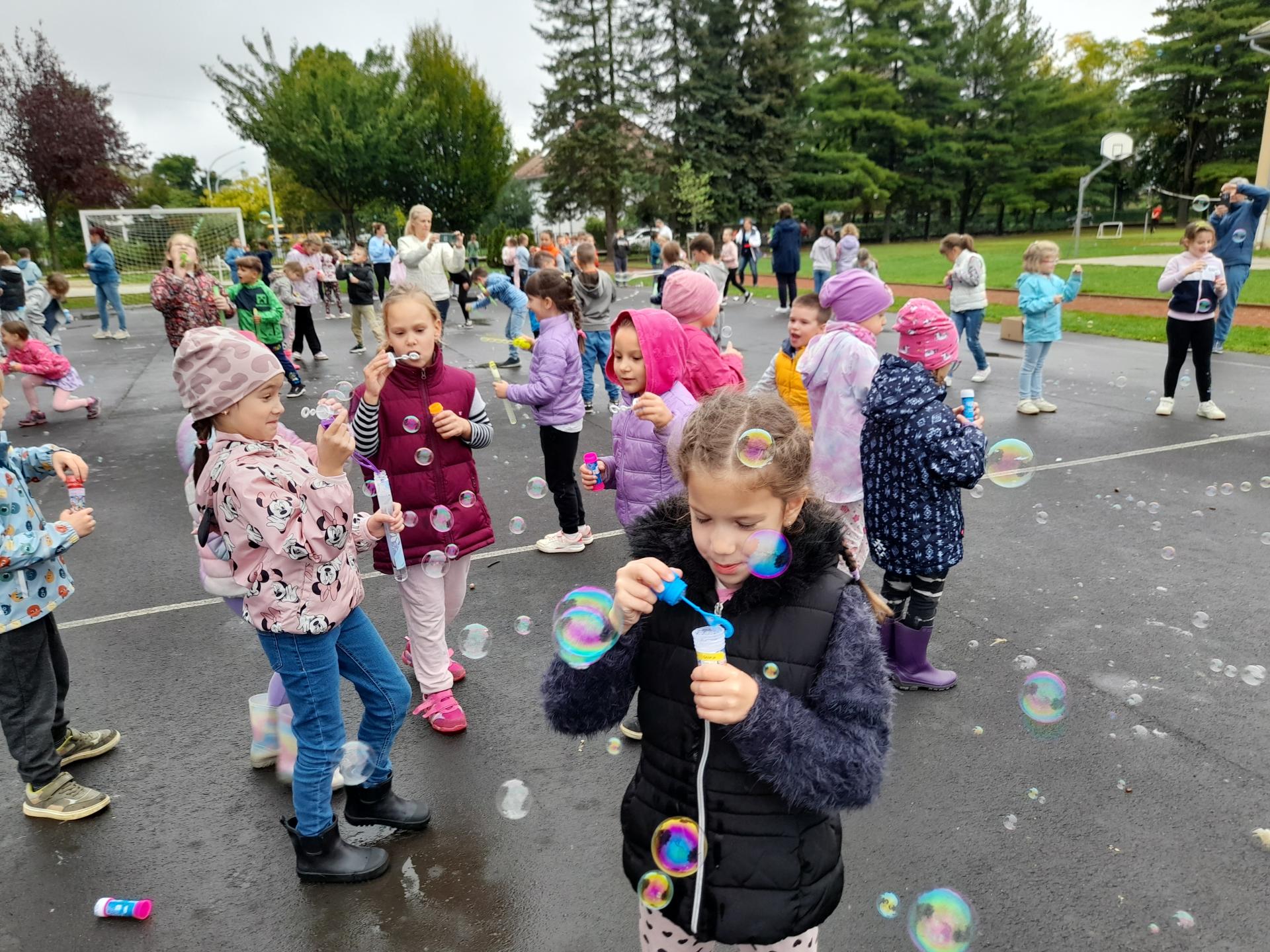 A mozgás szerelmesei sem maradtak élmények nélkül. A tornaterem vidám sportjátékoktól volt hangos, majd a zumba pezsdítő ritmusa mozgatta át a gyerekeket. Kint, a szürke ég alatt, a szappanbuborékok százai hoztak színt és kacagást – a buborékfújásnak köszönhetően az udvar pillanatokra szivárványszínbe öltözött.