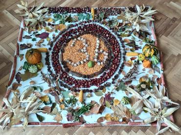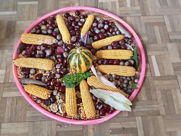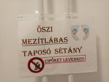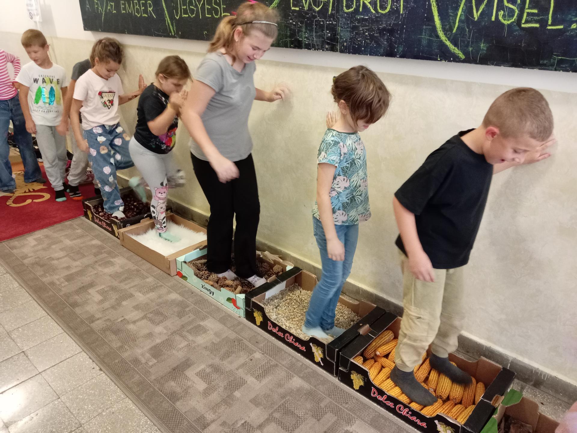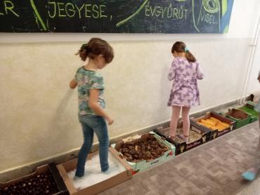 A nap egyik legizgalmasabb élménye a mezítlábas érzékelő volt: a gyerekek bátran léptek végig gesztenyén, kukoricán, tobozon, kavicson, fakérgen, felfedezve, milyen sokféle arcát mutatja az ősz a tapintás révén. A jókedvet csak fokozta a közös mondókázás, amelyben a gyerekek hangosan, ritmusosan, diót kopogtatva idézték meg az évszak játékos dallamait.