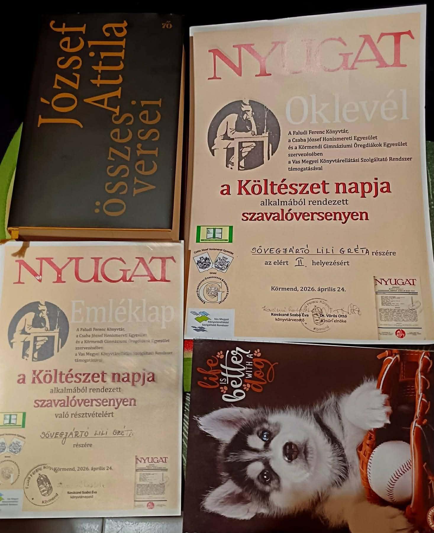 A Faludi Ferenc Könyvtár költészet napi szavalóversenyére április 24-én délelőtt került sor. A Nyugat című irodalmi folyóirat költőnemzedékeitől választhattak a verskedvelő diákok. Iskolánkat 7 tanuló képviselte: Boldizsár Míra, Bohus Dóra, Gujtman Ákos, Rozmán Anna és Sövegjártó Lili a 6. évfolyamról, Horváth Medárd és Kovács Réka pedig az 5. évfolyamról. Mindannyian felkészülten érkeztek, s szép szavalattal szerepeltek.