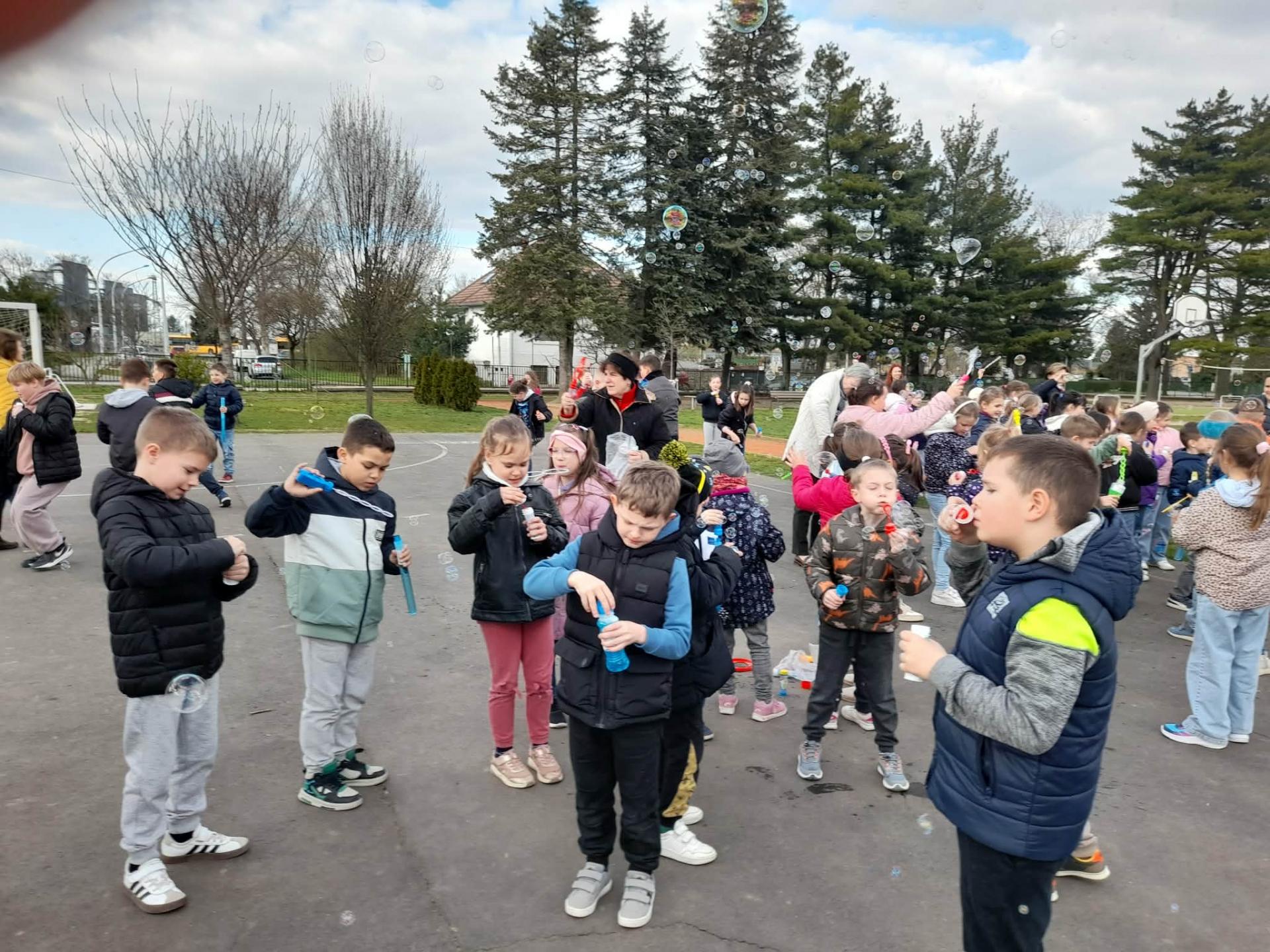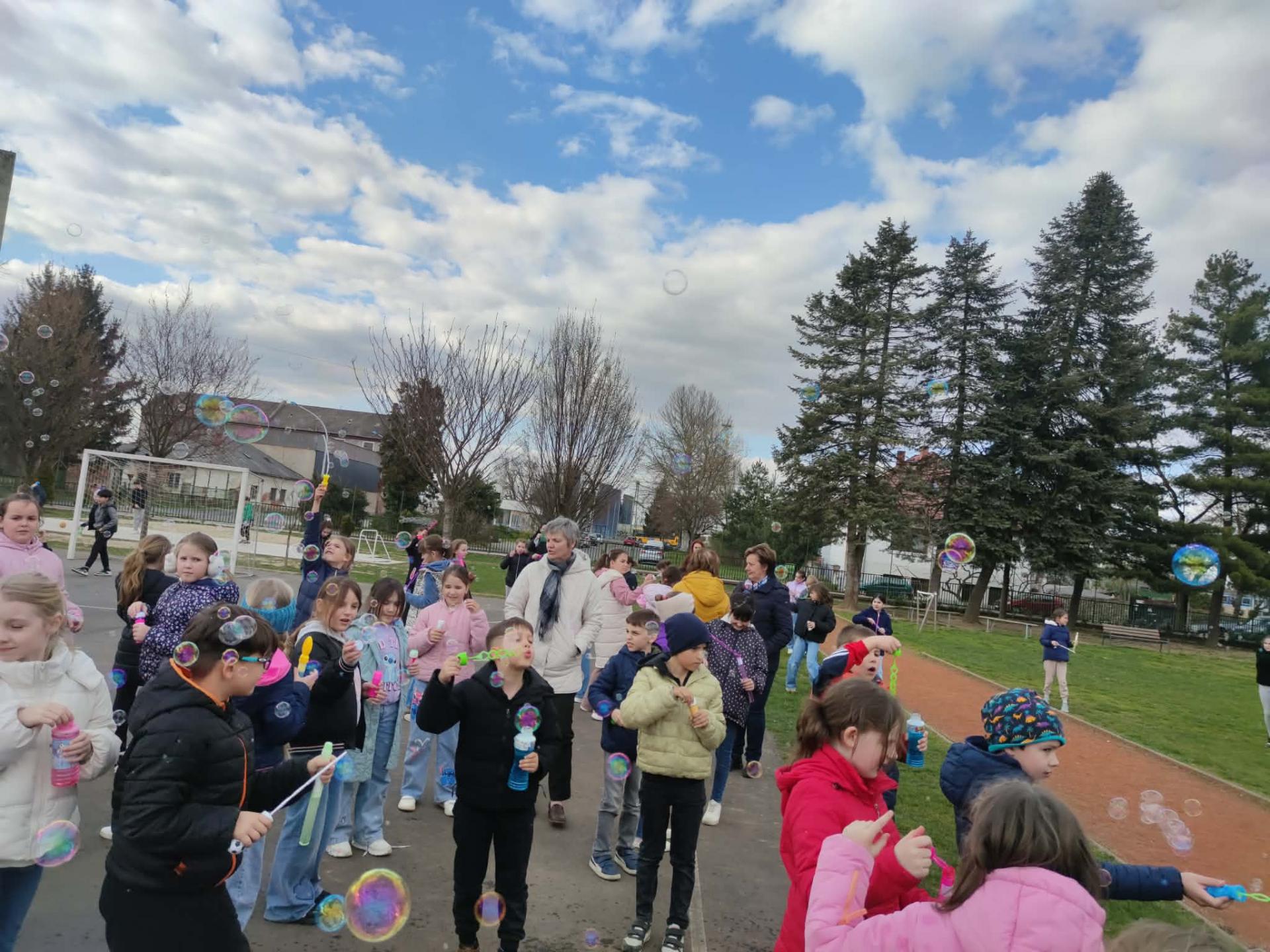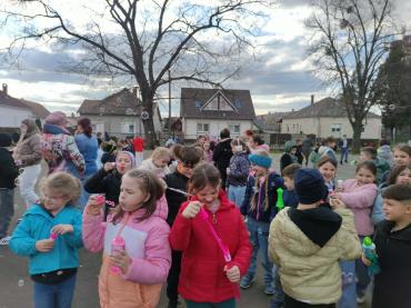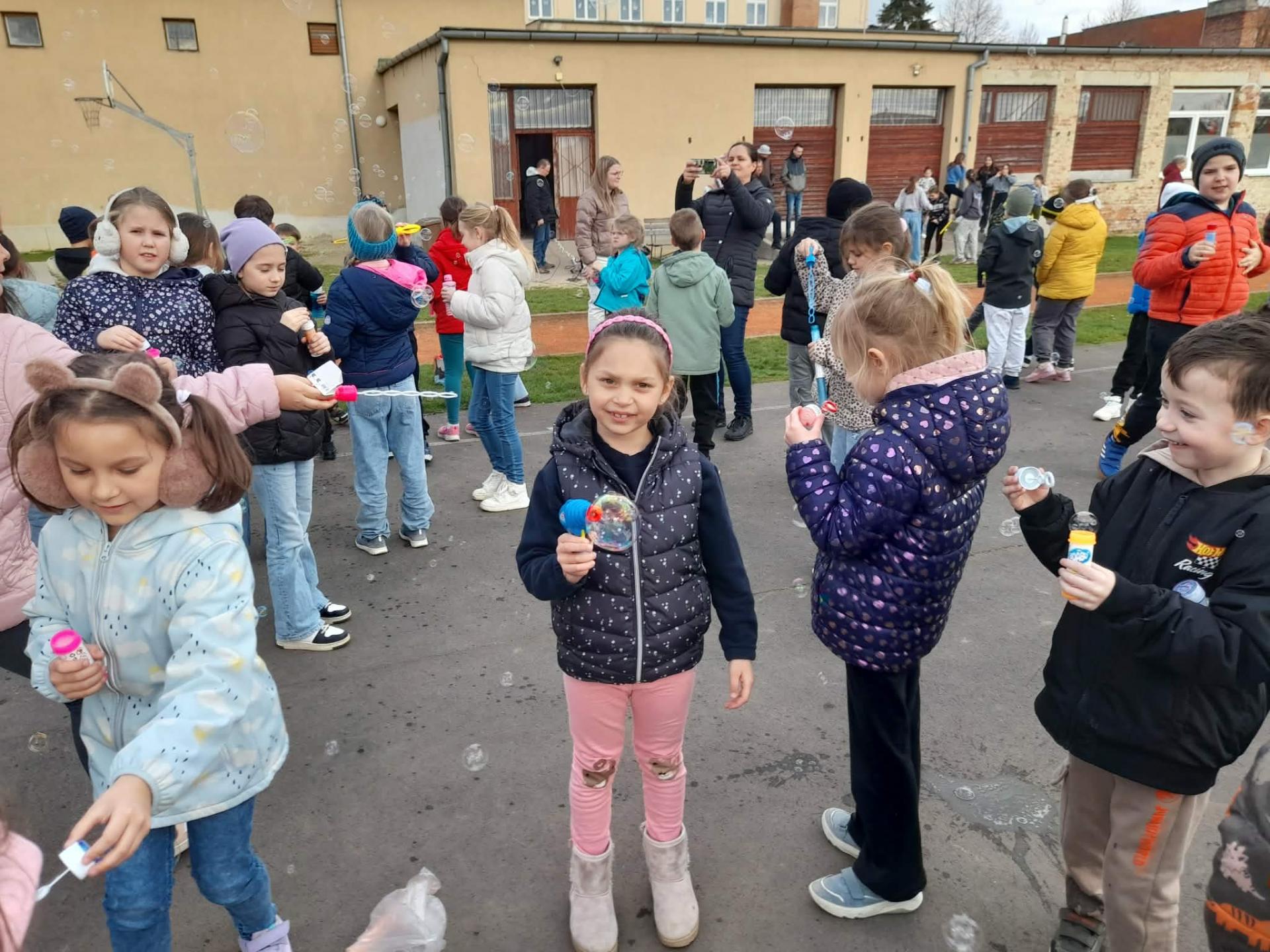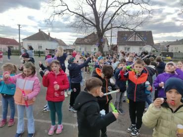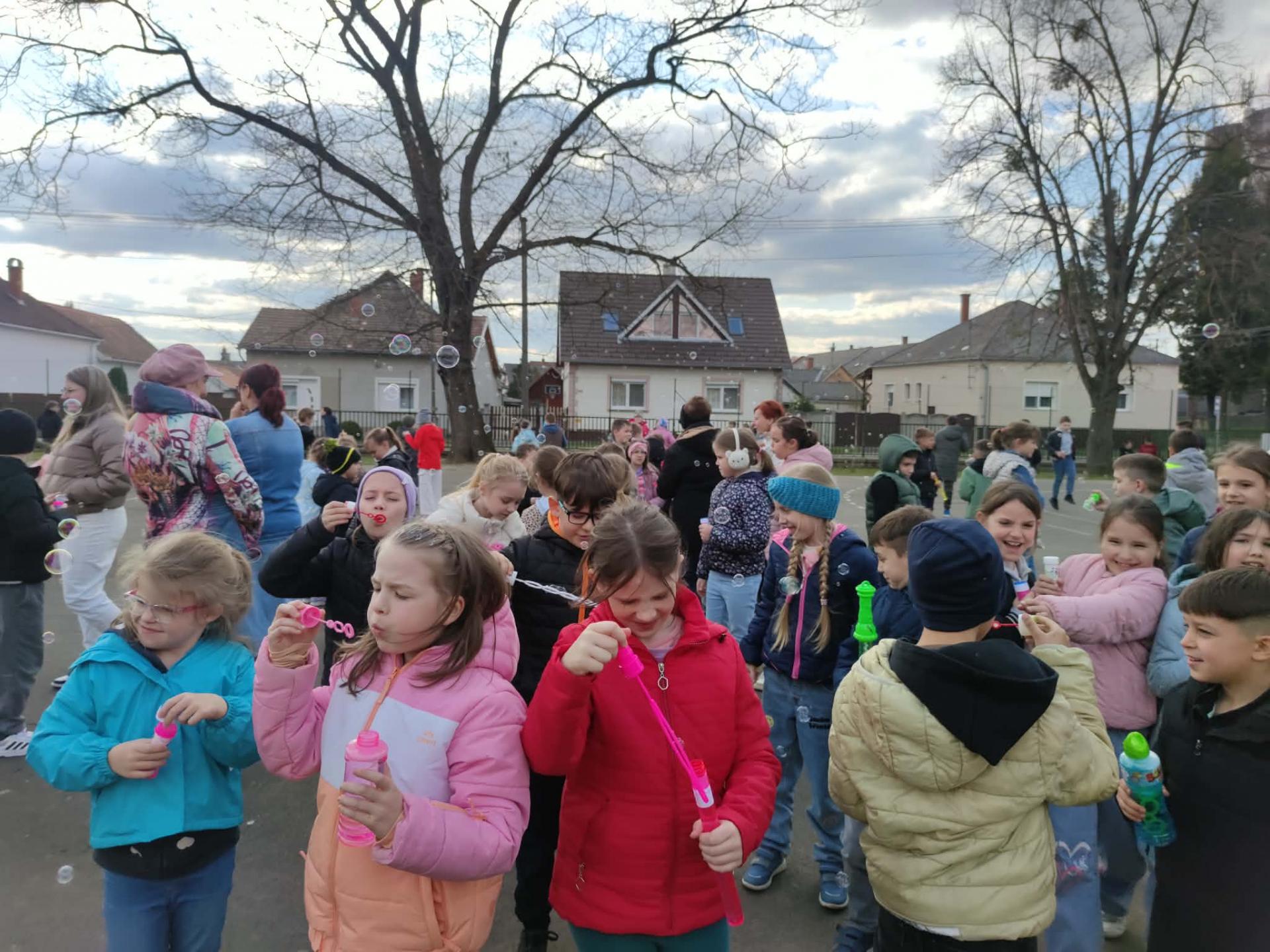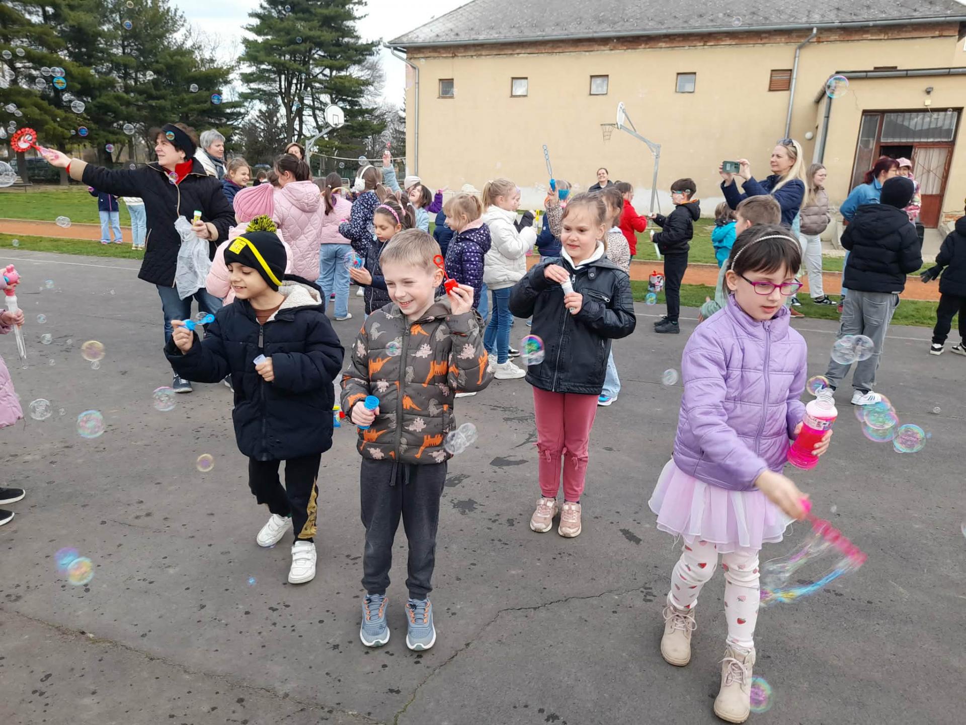 A program második fele az udvaron zajlott, ahol buborékfújásra hívtuk a gyerekeket egy kis zenével. Hamarosan buborékok százai szálltak a magasba egyszerre, miközben a gyerekek megpróbálták elkapni őket.