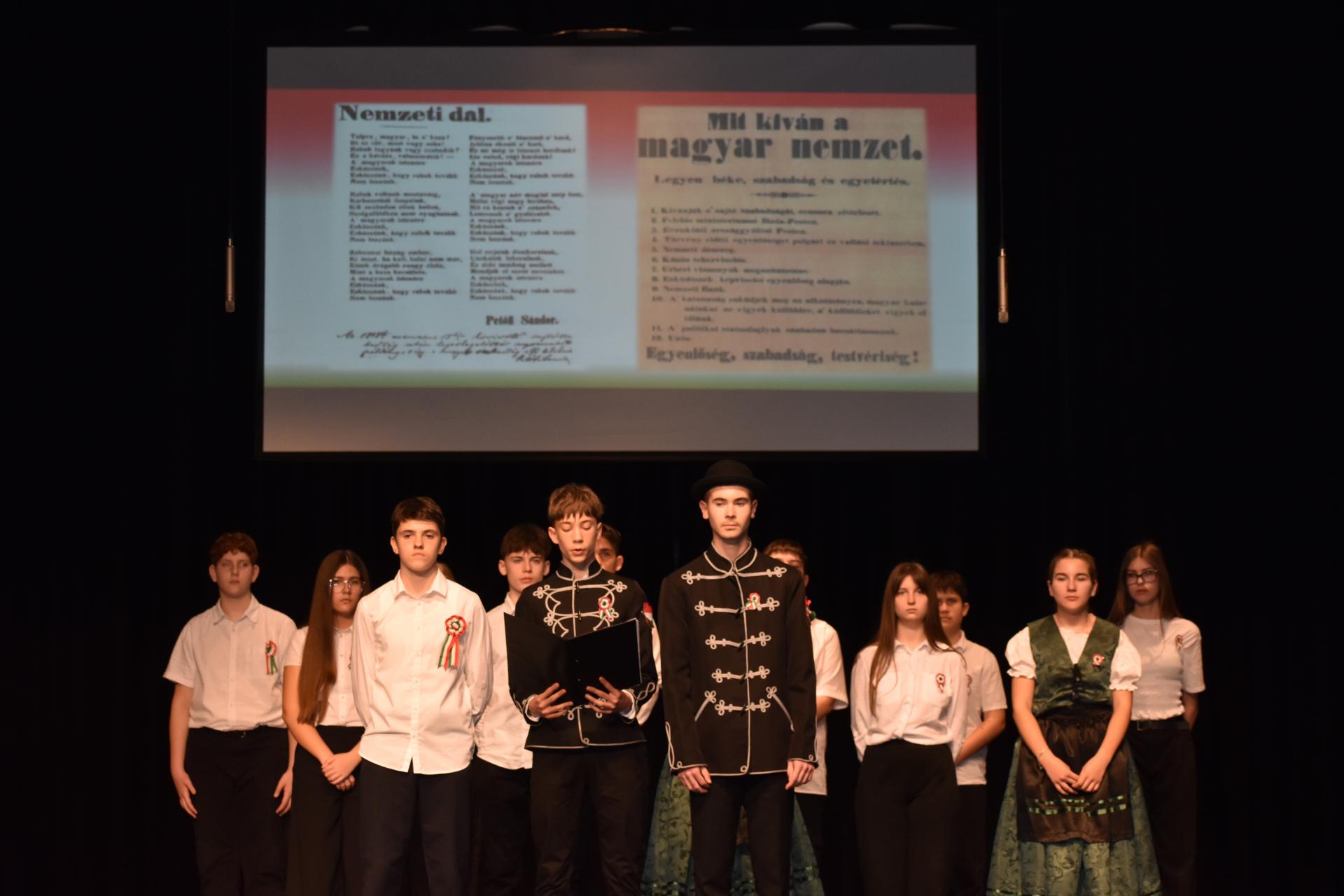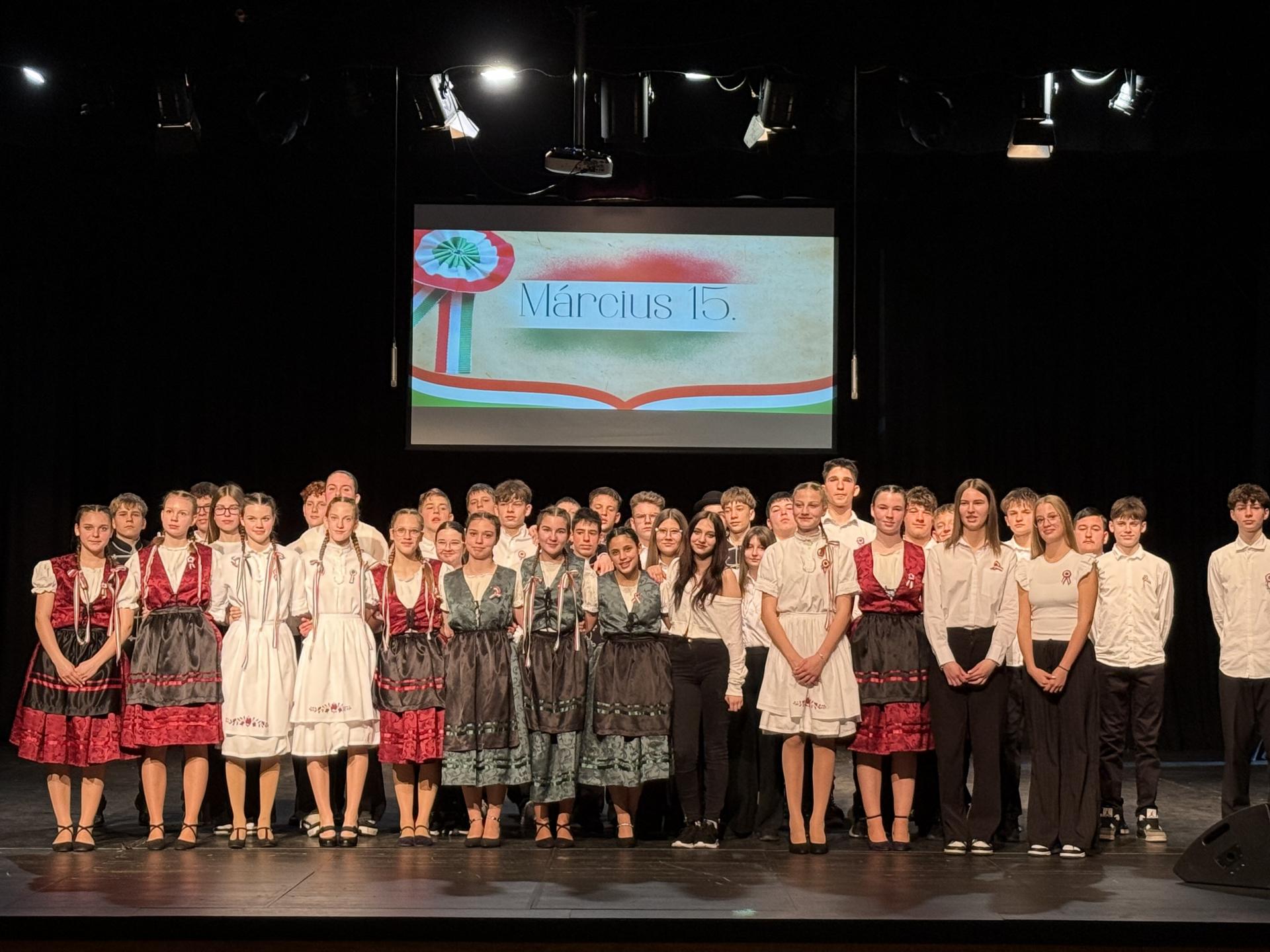 Idén iskolánk 8. évfolyamos diákjainak ünnepi műsorával emlékeztünk meg történelmünk kiemelkedő eseményéről, az 1848-as forradalom évfordulójáról. A tanulók két előadást mutattak be az Olcsai és a Somogyi iskola tanulóinak, nevelőinek, illetve a résztvevő szülőknek. A műsorban megidéztük a korszak várakozással teli hangulatát, és az ébredő természet lüktetését egyaránt. Vasárnap a városi megemlékezésen intézményünk képviseletében koszorút helyeztünk el a Kossuth-szobornál.